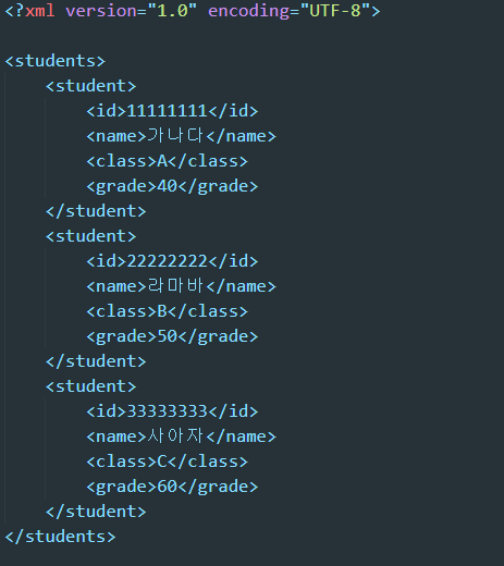 | 11111111,가나다,A,40 22222222,라마바,B,50 33333333,사아자,C,60 |