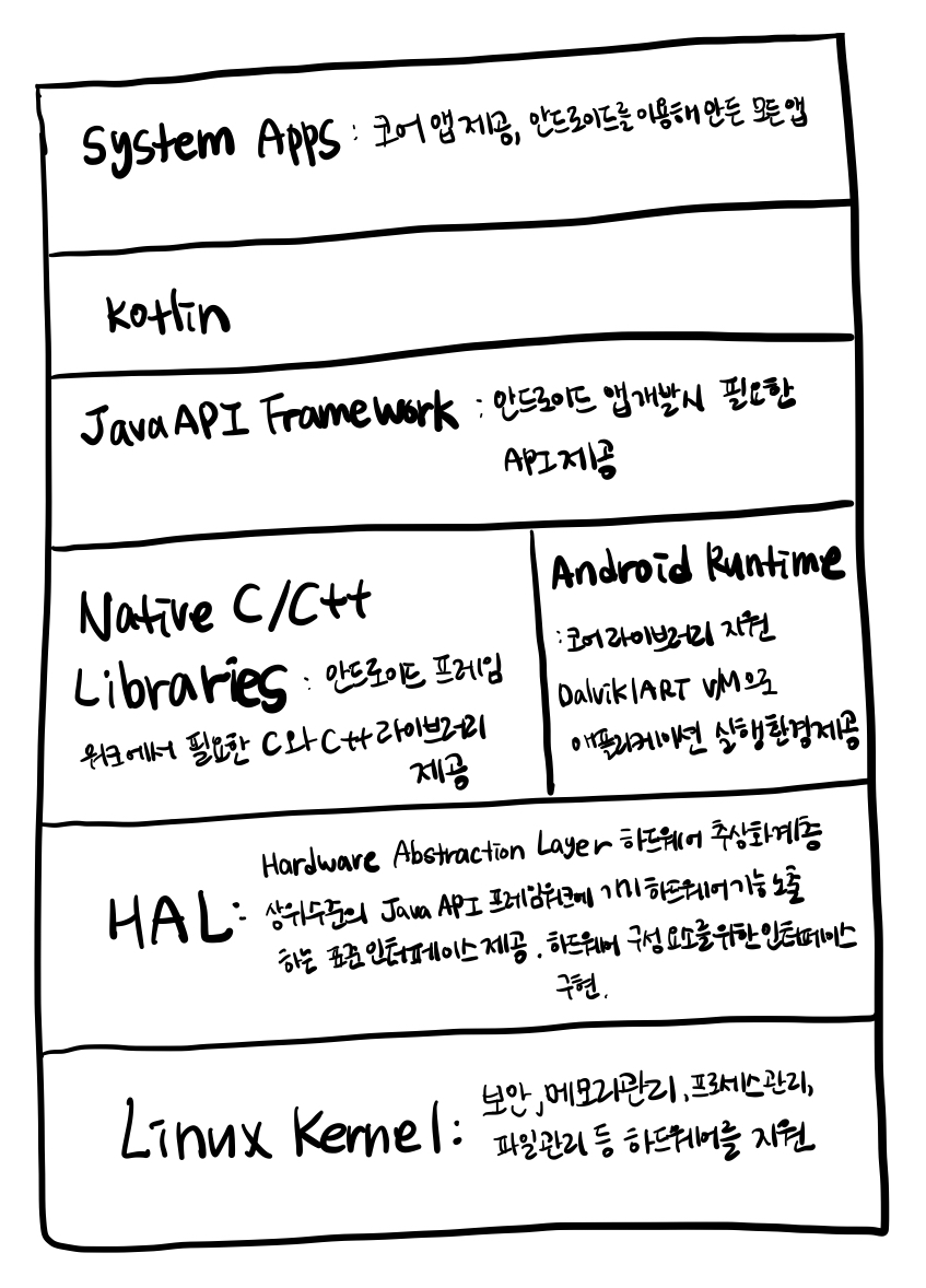 - Linux Kernel : 보안, 메모리관리, 프로세스관리, 파일시스템 관리, 파워 관리, 네트워크 스택, 하드웨어 드라이버 등 하드웨어를 지원