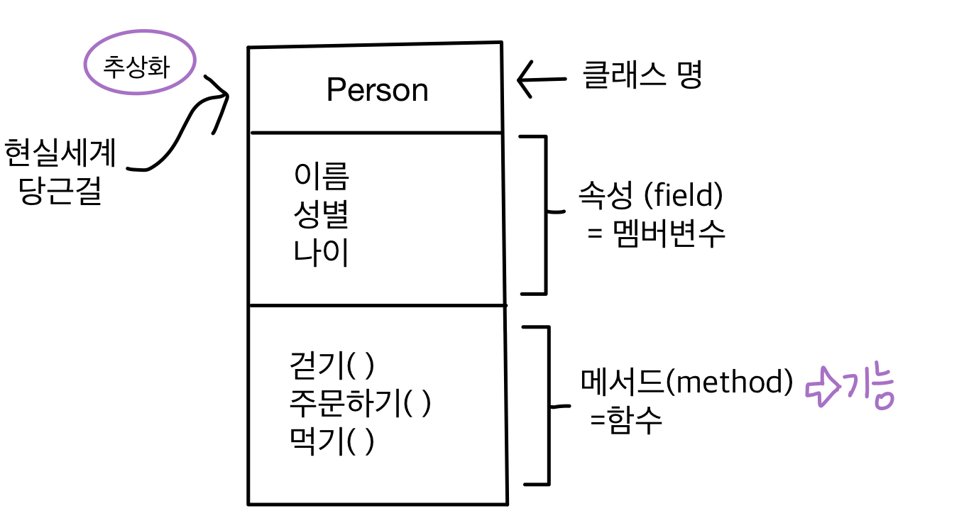 · method(메서드) : 객체의 동작 묘사 (기능). 작업 수행을 위한 코드의 집합